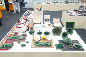サザエ、あわび、カキなど、自然がつくり出した特徴的な造形をモチーフにした器も展示しました。昔からある貝形の器に、現代的な加飾を取り入れたシリーズです。自然の造形ならではの立体感があり、会場でも多くの方が足を止めてご覧になっていました。テーブルの上でも目を引く器になりそうです。